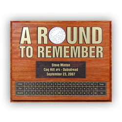 | A Round to Remember Plaque A Round to Remember Plaque allows you to commemorate a memorable round of golf. Perhaps it was because you shot your best score. Or maybe it was because you finally played a round at your dream course. Or maybe you shot a hole in one. When you have played that special round, display it proudly, so you will never forget it! Simply email or fax us your scorecard and we will do the rest.