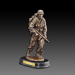 | Standing Military Award Our Standing Military Award is made of resin, and finished in an antique bronze. The figure is mounted to a black wood base. A brass plate is mounted to the base with your personalization. This is a great way to honor your Military Hero!